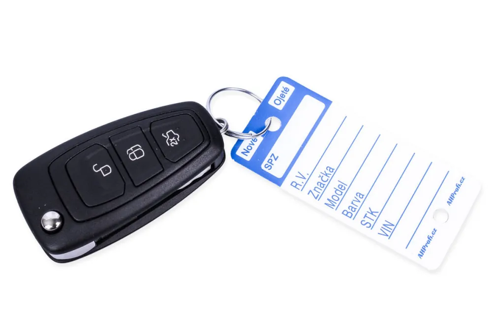 Bílé plastové visačky na klíče s modrým potiskem jsou velkou pomůckou převážně pro autobazary, případně autosalony pro snadnou identifikaci klíčů. Jednoduše pak poznáte, kterému autu klíček patří díky vyplněným polím na jmenovce. Permanentním fixem, který je přiložen jako dárek, napíšete na cedulku na klíče SPZ, rok výroby, značku, model a barvu vozu. Datum STK a VIN, zaškrtnete zda se jedná o nové či ojeté vozidlo. Použitím permanentního fixu nemusíte řešit smývání, ušpiněné prsty apod. Na klíče připevníte rozlišovač za pomoci přiloženého kroužku, což může být o trochu složitější než instalace u modelů Easy-ON, nebo Econo ID.