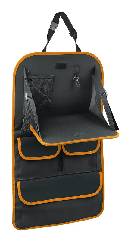 Organizér s rozměry 40,5 x 69,5 cm chrání sedadlo před znečištěním a je zhotoven ze 100% polyesteru, kvalitně obšitého oranžovým lemem. Snadno a rychle se uchycuje na zadní stranu přední sedačky automobilu pomocí nastavitelného popruhu s klipem a pomocí provázků.