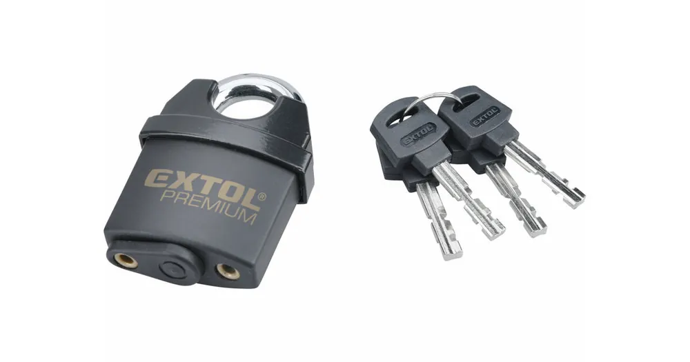 Zámek Extol Premium má cylindrickou vložku z mosazi a vnitřní kovové části jsou pozinkované – zvyšuje jeho odolnosti. Plastový kryt chrání vnitřní kovové části před vodou a nečistotami, takže je vhodný pro venkovní použití.